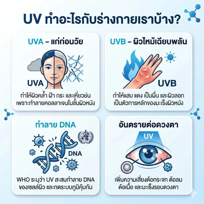 ทำลาย DNA WHO —ระบุว่า UV สะสมทำลาย DNA ของเซลล์ผิว และกดระบบภูมิคุ้มกัน